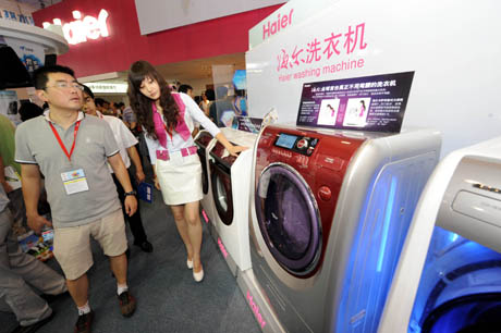 在日前舉行的2009中國(guó)國(guó)際消費(fèi)電子博覽會(huì)(SINOCES)上,觀眾正在了解全球首款不用彎腰操作的洗衣機(jī)。 |