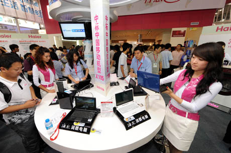 在日前舉行的2009中國(guó)國(guó)際消費(fèi)電子博覽會(huì)(SINOCES)上,觀眾在3G體驗(yàn)區(qū)試用上網(wǎng)專用筆記本電腦。 |