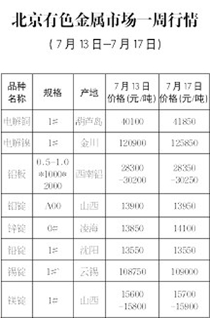 北京有色金屬市場一周行情[7月13日-7月17日]