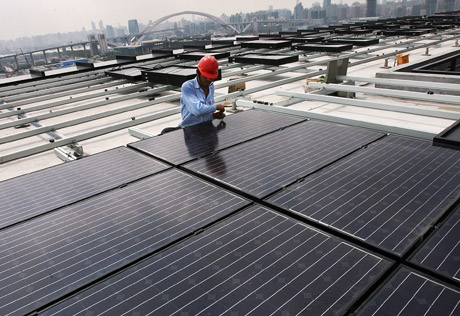 工人在上海世博會(huì)中國(guó)館頂層安裝太陽能電池板。據(jù)現(xiàn)場(chǎng)工程技術(shù)人員介紹,這些太陽能電池板每塊面積約為1.3平方米,共計(jì)1264塊,在陽光充足的理想條件下,每小時(shí)能為中國(guó)館供電約300千瓦時(shí)。新華社發(fā) |