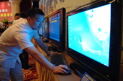 日前,數(shù)源科技公司發(fā)布搏卡系列數(shù)字電視,在網(wǎng)絡(luò)環(huán)境下可通過更換不同的功能卡,實(shí)現(xiàn)數(shù)字電視、電腦、多媒體播放器等功能的切換。圖為數(shù)源科技公司開發(fā)部負(fù)責(zé)人在展示利用電視屏幕上網(wǎng)沖浪。