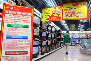 日前,天津市全面展開(kāi)家電以舊換新工作。據(jù)天津市商務(wù)委有關(guān)負(fù)責(zé)人介紹,家電銷(xiāo)售企業(yè)和回收企業(yè)已經(jīng)通過(guò)招標(biāo)方式確定向社會(huì)公布,消費(fèi)者可在交售舊家電購(gòu)買(mǎi)新家電時(shí)享受家電補(bǔ)貼。此次列入家電以舊換新補(bǔ)貼產(chǎn)品范圍的品種有電視機(jī)、電冰箱,洗衣機(jī)、空調(diào)、電腦。圖為天津一家電賣(mài)場(chǎng)在顯著位置擺放家電以舊換新宣傳展板。