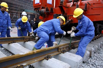 11月18日,鐵路建設(shè)者在漢宜高速鐵路宜昌段施工現(xiàn)場鋪軌。當(dāng)日,漢宜高速鐵路開始鋪軌。漢宜高速鐵路東起漢口,西接宜昌,是我國“四縱四橫”鐵路主干網(wǎng)絡(luò)中滬漢蓉高速客運專線的一部分,為國家一級雙線電氣化鐵路,設(shè)計時速200公里。該鐵路將于2011年底全部竣工,屆時坐火車不到2小時便可從武漢到達宜昌。新華社發(fā)(文振效