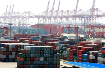 上海洋山深水港碼頭一景。上海市交通運輸和港口管理局發(fā)布的數(shù)據(jù)顯示,預計2009年上海港的貨物吞吐量將完成5.8億噸,基本與上年持平。新華社記者 陳飛
