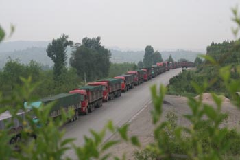 隨著夏季之前電煤運輸高峰期的到來,連通陜西省神木縣和山西省的煤炭資源外運大通道神(木)盤(塘)公路上的運煤車輛排起長龍。本報記者 梁愛平