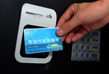 日前,位于杭州城西古翠路的杭州首座智能電動(dòng)汽車充電站落成。圖為充電站一名工作人員演示電動(dòng)汽車充電卡使用方法。新華社記者 韓傳號(hào)