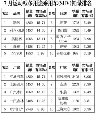 7月多功能乘用車(MPV)銷售3.10萬輛,環(huán)比下降10.10%,同比增長76.37%;其中2.0L、2.4L和1.8L排量車型銷量占比較大,銷量占比分別為24.01%、14.57%和14.19%。 與上月相比,除了東方之子Cross、開瑞優(yōu)雅排名不變外,瑞風(fēng)與別克GL8、奧德賽與森雅名次互換,菱智與途安闖入十強,普利馬與風(fēng)行退出十強,NV200與閣瑞斯名次均上升兩位,分別由第七、第九上升至第五、第七。 7月瑞風(fēng)表現(xiàn)最突出,較上月大增29.54%,超過GL8取得第一,GL8較上月下降13.82%,屈居第二;奧德賽較上月增長14.24%,取得第三,森雅表現(xiàn)不佳,較上月下降22.97%,退為第四;新品NV200較上月增長6.86%,閣瑞斯名次上升銷量下降,較上月下降15.28%;而處于高銷量后回落期的普利馬在上月環(huán)降27.22%后,7月無緣前10。 與上月相比,銷量排名前10位的MPV企業(yè),除了奇瑞排名第七不變外,其它均有變化。前六位中,江淮汽車與上海通用,廣汽本田與一汽吉林,鄭州日產(chǎn)與東風(fēng)柳汽名次互換,上海大眾憑借途安的表現(xiàn)闖入前十,海馬汽車退出十強,華晨與福建戴姆勒名次均上升一位,分別由第九、第十上升至第八、第九。 |