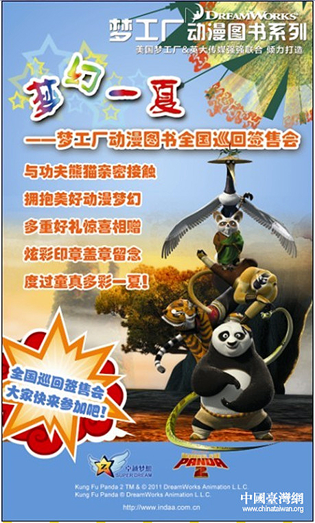 此外,“夢幻一夏”——夢工廠系列圖書全國巡回功夫熊貓人偶簽售會活動將于7月至8月登陸上海、廣州、成都、青島、南京等地,為青少年小讀者們帶來一個炫彩夢幻的暑期動漫風暴。