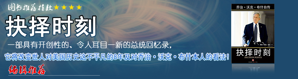 戒掉酒癮、在得克薩斯政府工作——等等這一切,都在《抉擇時刻》這本敘述他八年就職生涯的回憶錄中有了合適的解讀。在此書當(dāng)中的布什呈現(xiàn)了這樣一個平和、樂于協(xié)商、通情達(dá)理、思維開放、值得信賴,同時虔誠敬神、忠誠愛國的形象。 |