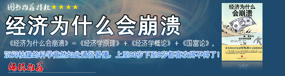 自高中時代以來,我就對經濟學十分感興趣。于是,滿懷期待地來到大學,希望對貨幣和經濟政策有所了解?墒俏业奶彀!我簡直不知道他們在學校里都教了我們什么,那些莫名其妙的術語讓人覺得極端無聊,某位古怪糊涂的教授滿嘴專業(yè)詞匯喃喃自語,除了這些,我回憶不起來任何有價值的東西……當我看到《經濟為什么會崩潰》一書時,非常興奮。迄今為止,還沒有哪本經濟學入門讀物能超越這本書。所有人都能在兩小時內讀完它,都能明白當今世界的貨幣政策和政府財政政策中的謬論,都清楚這些謬論正把我們引上毀滅之路。 |