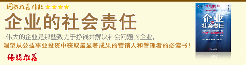| 對(duì)于渴望從公益事業(yè)投資中獲取最顯著成果的營(yíng)銷人和管理者來(lái)說(shuō),《企業(yè)的社會(huì)責(zé)任:通過(guò)公益事業(yè)拓展更多的商業(yè)機(jī)會(huì)》是一本必讀書。我們應(yīng)該支持哪些社會(huì)公益事業(yè)?哪些慈善機(jī)構(gòu)將成為我們牢固的合作伙伴?我們應(yīng)該發(fā)展哪些半為企業(yè)以及公益事業(yè)謀取最大利益的社會(huì)活動(dòng)?我們是要僅僅開(kāi)一張支票嗎?要把社會(huì)信息結(jié)合到我們的廣告宣傳中嗎?我們要怎樣把一項(xiàng)新的社會(huì)活動(dòng)整合到當(dāng)前的戰(zhàn)略中?為一個(gè)更美好的世界而營(yíng)銷〈人們常常問(wèn)為什么美國(guó)運(yùn)通在世界各地支持這么多的慈善組織,答案很簡(jiǎn)單……我們?cè)谏鐓^(qū)的幸福和安寧中享有既得利益……我們的慈善活動(dòng)已經(jīng)為我們的品牌增添了耀眼的光彩。 |