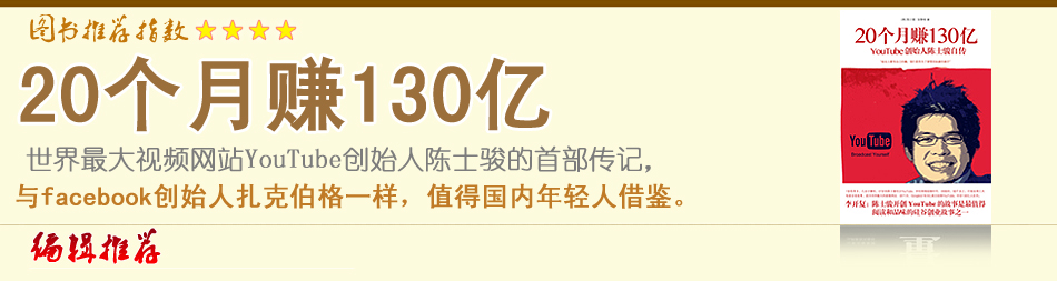 | YouTube聯(lián)合創(chuàng)始人陳士駿在書中以樸實親切的口吻講述了他的人生經(jīng)歷,以及對學(xué)業(yè)、事業(yè)、夢想、財富、生死等的種種感悟。值得一看。 |