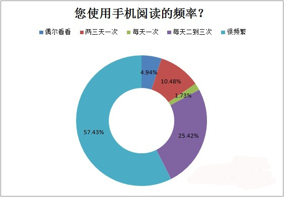 用戶使用手機閱讀的頻率又是怎樣呢?57.43%的用戶使用手機閱讀的頻率非常頻繁,手機的方便便利,讓用戶可以利用碎片化的時間,自然使用頻繁;25.42%的用戶使用手機閱讀的頻率為每天二到三次。也有一些用戶使用手機閱讀的頻率較低,10.48%的用戶兩三天閱讀一次,4.94%的用戶只是偶爾看看。