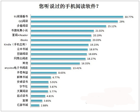 手機閱讀軟件已經(jīng)非常多,那么用戶聽說過的手機閱讀軟件又是哪些呢?91熊貓看書排在第一位,30.77%的用戶聽說過,QQ閱讀排在第二位,29%的用戶聽說過;多看閱讀排在第三位,25.12%的用戶聽說過,其次還有掌閱iReader、iBooks、Kindle(手機應(yīng)用)、云中書城、豆瓣閱讀等。