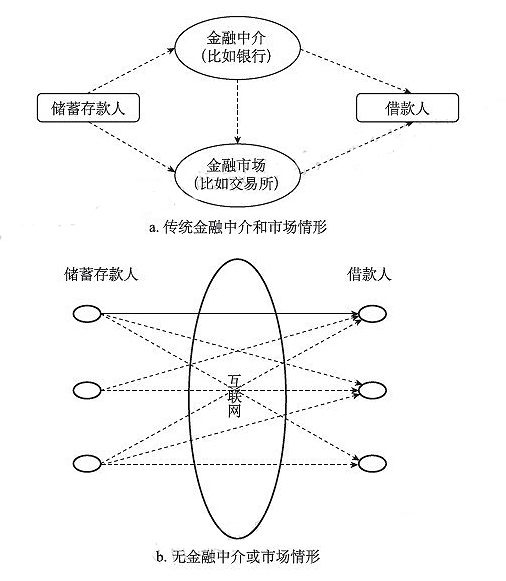 直觀的理解是,有M個資金供給者和N個資金需求者,兩邊通過各種金融中介和市場進行金額、期限、風險收益上的匹配,設想M和N趨于無窮大,并且金融中介和市場被互聯(lián)網(wǎng)替代。
