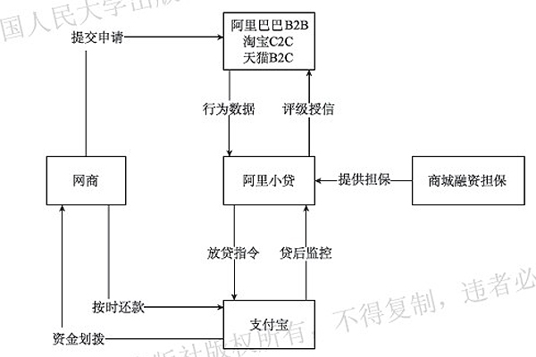 阿里小貸根據(jù)網(wǎng)商信用評(píng)分和商城融資擔(dān)保情況,決定給網(wǎng)商的貸款額度、利率和期限等。如果貸款獲批,客戶(hù)需要與阿里小貸簽署合同,綁定法人個(gè)人銀行卡和支付寶賬戶(hù)。阿里小貸進(jìn)行個(gè)人實(shí)名認(rèn)證和支付寶認(rèn)證,確認(rèn)支付寶貸款到賬金額。