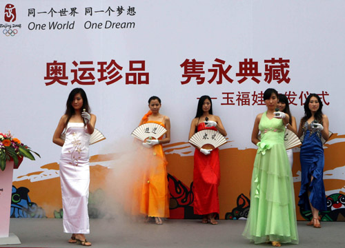 經(jīng)北京奧組委授權(quán)發(fā)行的“中國玉福娃”日前在北京王府井工美大廈舉行首發(fā)儀式!爸袊窀M蕖敝黧w部分由5個(gè)玉福娃和一個(gè)玉如意構(gòu)成,以新疆和田玉為材料,每套售價(jià)29萬元,全球限量發(fā)行2008套。圖為模特在首發(fā)儀式上展示“中國玉福娃”。