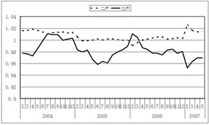 | 國家希望通過宏觀調控使得二產增速回落,三產增速回升。即二產電力需求強度下降,三產電力需求強度上升。 圖2所示:2004年4月二產電力需求強度開始有所回落,三產開始回升。2006年初三產達到1.01,接近2003年初的水平;二產電力需求強度也回落到0.992,大大低于調控前的水平。三產電力需求強度高于二產,宏觀調控效果明顯。 2006年4月以后,三產一路下滑,二產穩(wěn)步上升。進入2007年以來,二產增速加快,三產急劇下滑。二三產電力需求強度之差達到新高。由此可見,二產發(fā)展更快,三產發(fā)展更慢。 除2006年初以外,二產的電力需求強度始終大于1,并且還有上升的趨勢,說明其內在動力很大。 政府希望通過宏觀調控使得重工增速回落,輕工增速上升,達到促進輕工業(yè)的發(fā)展,調整輕、重工業(yè)結構的目的。表現(xiàn)在電力方面,希望重工電力需求強度下降,輕工電力需求強度上升。 圖3顯示:重工電力需求強度在2004年4月達到頂峰,此后開始回落。宏觀調控具有一定的效果。 今年重工電力需求強度增速加大,達到5月的1.03,高于調控前的水平。而輕工電力需求強度自2003年以來基本呈波浪式下降,達到今年4月的最低點,5月回升到0.955,低于調控前的水平。重輕工電力需求強度之差達到最大。這說明重工更重,輕工更輕,重輕工發(fā)展很不均衡,并仍有加大的趨勢。
