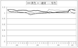 黑色、建材、有色是國家宏觀調控重點行業(yè)。因此,可以從它們的電力需求強度的變化分析宏觀調控政策的效果及重工快速發(fā)展的原因。 由黑色冶金電力需求強度的變化可以看出宏觀調控政策及行政手段對黑色行業(yè)的影響。黑色電力需求強度在2004年1至4月達到高峰(見圖4),為1.12。此后開始下滑到7月份的1.06。由于鋼材市場價格回升,驅動黑色電力需求強度上升到10月份的1.09。2004年10月29日央行加息0.27%的貨幣政策使得黑色電力需求強度在2005年初小幅回落,此后又下降到2006年初的0.99,低于調控前的水平,宏觀調控政策實施效果明顯。受國際鋼材價格的影響,2006年黑色電力需求強度基本呈小幅上升趨勢,但低于調控前的水平。顯然,這段時期價格的驅動力及黑色冶金行業(yè)的生產力小于宏觀政策的作用力及行政手段的控制力。宏觀調控對黑色冶金還有一定的作用。 受2007年國際鋼價的上升的驅動,黑色電力需求強度3月份達到1.121的新高,5月份回落的1.09,高于調控前的水平。此時,價格的驅動力及黑色冶金行業(yè)的生產力大于宏觀政策的作用力及行政手段的控制力,顯得宏觀政策乏力。 由圖4也可以看出宏觀調控政策對建材的影響:建材電力需求強度由2004年初的小高峰下降到2005年一季度的低谷,首次跌破1。經小幅回升機波動,今年2月份達到新高后,又回落到5月份的0.985,低于調控前的水平。宏觀政策的作用力及行政手段的控制力大于價格的驅動力及建材行業(yè)的生產力,宏觀調控政策對建材行業(yè)的快速發(fā)展基本起到了降溫的作用,宏觀調控具有一定的效果。