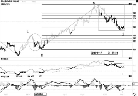圖一:黃金在重要阻力位1000美元附近遇阻回落,市場進(jìn)入4浪性質(zhì)的蓄勢整理行情當(dāng)中,后市一旦沖破1000美元阻力,則上升空間將被放大。