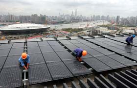 9月1日,工人正在上海世博會中國館屋頂安裝單晶光伏組件。中國館和主題館兩個(gè)場館的太陽能總裝機(jī)容量達(dá)3127千瓦。建成后年均可發(fā)電284萬度,每年可節(jié)約標(biāo)準(zhǔn)煤1000噸,年均減排二氧化碳約2500噸,二氧化硫84噸,氮氧化物42噸,煙塵762噸。新華社記者任瓏 攝 |