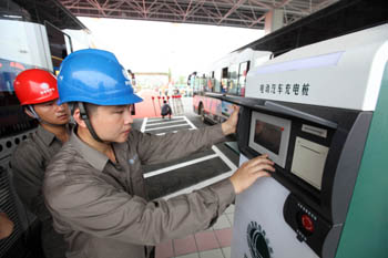 8月10日,在湖北襄樊市鄧城電動汽車充電站,工作人員準備為電動大客車充電。 當日,襄樊市鄧城電動汽車充電站正式投入使用,它是湖北首座電動汽車充電站。該充電站可同時為10輛大巴、20輛中巴和30輛轎車充電。它還設有50組蓄電池的電動汽車換電區(qū),可直接更換蓄電池,減少電動汽車電能補給時間,滿足應急充電需求及長途旅行需要。 新華社發(fā)(張文華/攝)