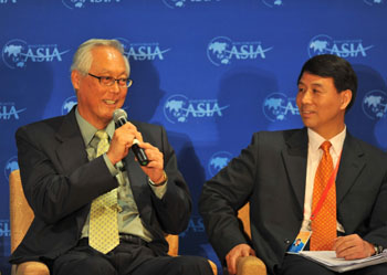 反貿(mào)易保護(hù)主義事關(guān)全球經(jīng)濟(jì)復(fù)蘇。4月10日,博鰲亞洲論壇“貿(mào)易保護(hù)主義:全球經(jīng)濟(jì)脆弱復(fù)蘇的現(xiàn)實(shí)威脅”主題午餐會(huì)在海南博鰲舉行。圖為新加坡前總理、國務(wù)資政吳作棟(左)在發(fā)言。新華社記者 郭程/攝 |