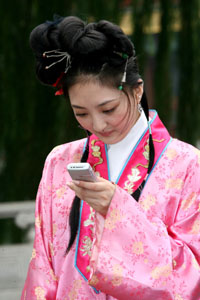 在北京大觀園參加新版電視劇《紅樓夢》選秀的“黛玉”玩起了手機。