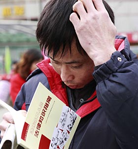 法律日益成為打工者手中的工具和武器 2月18日,來(lái)自安徽的務(wù)工人員魏磊在上;疖(chē)站南廣場(chǎng)翻閱派發(fā)的法律知識(shí)指南。當(dāng)日,上海市閘北區(qū)司法局、法院、勞動(dòng)局、民政局等單位在上;疖(chē)站南廣場(chǎng)舉辦春運(yùn)法制宣傳活動(dòng),現(xiàn)場(chǎng)為返滬務(wù)工人員提供相關(guān)政策和法律的咨詢(xún)服務(wù),引導(dǎo)他們自覺(jué)遵守法律、法規(guī),依法維護(hù)自身合法權(quán)益。新華社記者