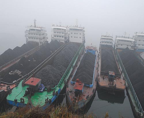 濃霧籠罩三峽庫區(qū) 3月13日上午,貨運船舶在湖北省秭歸縣蘭陵溪村等待霧散后過閘。 受今春以來首場濃霧影響,三峽雙線五級船閘和下游的葛洲壩船閘均中斷通航超過10小時,造成三峽庫區(qū)內(nèi)部分船舶滯留。新華社發(fā)(鄭家裕