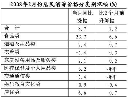 2月份,居民消費價格水平同比上漲8.7%,漲幅比上年12月份上升2.2個百分點,呈迅速增大的走勢。由于今年的春節(jié)時間比去年早,春節(jié)因素對2月份價格的影響不如上年大,因此漲幅增大不是由這一因素引起的。簡單地歸結(jié)為災(zāi)害因素的影響也是不全面,應(yīng)該說一部分原因是價格上升趨勢本身的作用。 食品價格仍是居民消費價格漲幅增大的主要帶動因素(見下表)。在8大類別中,唯有食品價格漲幅在2個月內(nèi)增大6.6個百分點,其他7個類別的變動幅度均不到1個百分點。在食品價格中,上升幅度最大的鮮菜價格,上漲46%,漲幅比2個月前增大36.5個百分點,成為新的主要推動因素。