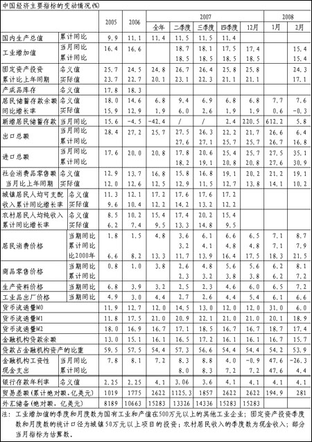 2月份,受冰雪災(zāi)害的影響,我國產(chǎn)出、投資等實質(zhì)性經(jīng)濟(jì)指標(biāo)的增長速度普遍回落,價格漲幅則迅速增大;緊縮性貨幣政策效果有所顯現(xiàn),金融運行狀況趨于平穩(wěn),進(jìn)口增長速度大幅上升。