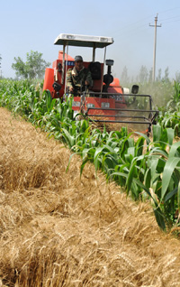 小型收割機(jī)正在青銅峽市一塊麥田里作業(yè)。今年寧夏回族自治區(qū)夏糧喜獲豐收,預(yù)計(jì)總產(chǎn)可達(dá)6.6億公斤,比去年增產(chǎn)0.5億公斤,增幅8%,其中小麥總產(chǎn)有望達(dá)到6.43億公斤。新華社記者:馬俊