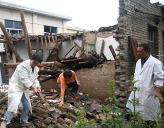 8月31日15時多,幾位醫(yī)務(wù)人員在會理縣黎溪鎮(zhèn)會南人民醫(yī)院倒塌的房屋前收拾殘局。新華社記者:陳海寧 攝