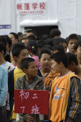 攝 | 9月8日,攀枝花地震重災(zāi)區(qū)元謀縣姜驛鄉(xiāng)15所中小學(xué)校全部開學(xué)。在姜驛中心小學(xué),740名四里八鄉(xiāng)的彝族、傈僳族孩子們,走進(jìn)了解放軍叔叔為他們新搭建的“帳篷學(xué)!,領(lǐng)到了部隊(duì)贈送的各種文具及生活用品。 四川攀枝花地震中,距震中僅17公里的姜驛鄉(xiāng)受災(zāi)嚴(yán)重,全鄉(xiāng)學(xué)校不同程度受損,當(dāng)?shù)卣疀Q定推遲至9月8日開學(xué)。駐滇某師高炮團(tuán)完成搶救群眾生命財(cái)產(chǎn)的任務(wù)后,于9月3日緊急投入到援建受災(zāi)學(xué)校的戰(zhàn)斗中。5天來,這個團(tuán)為確保受災(zāi)學(xué)校如期開學(xué)而突擊,累計(jì)出動官兵1600余人次,從危房中搶救出價值20余萬元的課桌、教材等,平整場地5000余平方米,搭建活動板房18間、帳篷248頂,贈送了價值4.5萬余元的教學(xué)物資和學(xué)習(xí)生活用品。 7日晚,最后一批鐵床材料和組裝課桌緊急運(yùn)抵姜驛后,團(tuán)長蘇小林和二營官兵通宵作業(yè),緊急焊裝組合鐵床159鋪、課桌700張,一直忙碌到天亮,沒有誤了學(xué)生如期開學(xué)上課。 在整潔有序的學(xué)生住宿帳篷區(qū),來自阿拉益村的姜驛中學(xué)初一學(xué)生杞金麗找到了貼有自己姓名的床鋪。她開心地看到,散發(fā)著新棉絮香味的被子鋪好了,床下整齊地?cái)[放著拖鞋、臉盆和洗漱用具。當(dāng)她沿著床梯往上鋪爬時,發(fā)現(xiàn)連鐵床轉(zhuǎn)角焊接的鋒利處,都被解放軍叔叔細(xì)心地纏上了布墊。“解放軍叔叔為我們想得太周到了!”杞金麗感動地說。 上午,帳篷里傳出瑯瑯讀書聲,但官兵們并沒有休息,五連排長吳榮春正帶著戰(zhàn)士們在剛剛開辟的學(xué)校臨時食堂附近,用砍刀清除著兩側(cè)的荊棘……