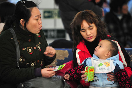 1月11日,在廣州火車站母嬰候車室里,兩位旅客在逗孩子玩。
