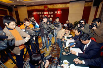 2006年2月28日,《浙江省物業(yè)管理條例(草案)》立法聽證會在杭州舉行,聽證陳述人就草案中的有關問題發(fā)表了意見和建議。新華社發(fā) |