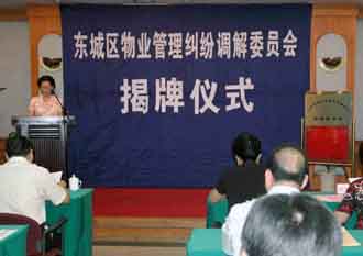 2005年8月30日,北京市東城區(qū)物業(yè)管理糾紛調解委員會揭牌。該委員會是在政府支持下建立的一種專業(yè)性的社會調解組織,也是東城區(qū)探索多元化矛盾糾紛化解機制的一個創(chuàng)新。其目的是通過政府的扶持,大力培育非政府的社會組織,吸引具有較高法律水準的專業(yè)人員調解社會紛爭,增強化解社會矛盾的權威性。新華社發(fā)
