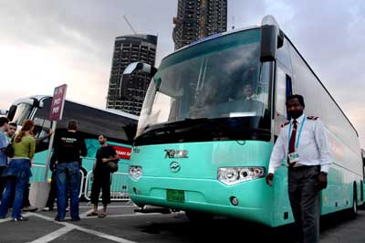 26日,在多哈亞運會新聞中心班車停車場,幾名記者正準備乘坐班車前往體育場館。第15屆亞運會12月1日將在卡塔爾首都多哈開幕,來自中國的500輛海格客車被選定為亞運會賽事專用車,用于比賽期間運動員、官員及媒體記者的接送工作。