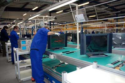 6日,在捷克的寧布爾克,幾名工人在四川長(zhǎng)虹集團(tuán)公司投資建設(shè)的電視機(jī)廠生產(chǎn)流水線上裝配電視。長(zhǎng)虹在捷克首期興建的這家電視機(jī)廠建筑面積為3.3萬(wàn)平方米,共有5條生產(chǎn)線,年產(chǎn)50英寸以下各種平板電視和CRT電視100萬(wàn)臺(tái)。這也是四川長(zhǎng)虹集團(tuán)公司在歐洲的第一家工廠。 |