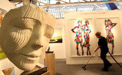 1月16日,在英國倫敦商業(yè)設計中心,工作人員在倫敦藝術品交易會的一個展位附近做清潔。第19屆倫敦藝術品交易會將于1月17日至21日在這里舉行。
