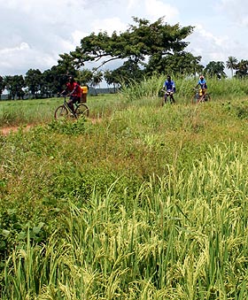 中墾集團(tuán)下屬的中幾農(nóng)業(yè)合作開發(fā)公司自1997年起在幾內(nèi)亞首都科納克里附近的科巴農(nóng)場(chǎng)開展水稻種植項(xiàng)目。幾年來,科巴農(nóng)場(chǎng)不僅在解決幾內(nèi)亞人民吃糧難的過程中發(fā)揮了重要作用,而且?guī)椭車鷶?shù)百戶居民掌握了水稻種植技術(shù)。這是幾內(nèi)亞科巴農(nóng)場(chǎng)的工人騎車經(jīng)過即將豐收的稻田。新華社記者