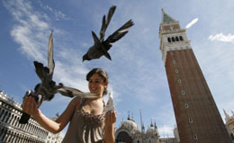 這張2006年8月29日拍攝的照片顯示的是一名游客在意大利威尼斯的圣馬克廣場喂鴿子,畫面右側(cè)是威尼斯標(biāo)志性建筑、高99米的鐘樓。據(jù)報(bào)道,意大利威尼斯地方政府正在籌劃用鈦合金制成的金屬帶加固圣馬克廣場鐘樓,以防止它倒塌或變?yōu)榈诙靶彼,工程將耗資數(shù)百萬美元。