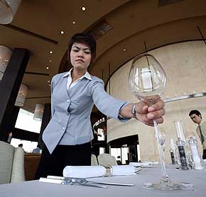 10日,服務(wù)員在泰國曼谷的一家餐廳擺放餐具。泰國近日推出11道菜的天價(jià)節(jié)日套餐,價(jià)格高達(dá)每人29000美元。新華社/法新