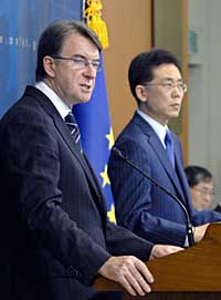 6日,歐盟貿(mào)易委員曼德爾森(左)和韓國外交通商部通商交涉本部長金鉉宗在韓國首都首爾出席新聞發(fā)布會。韓國與歐盟當日宣布正式就簽署自由貿(mào)易協(xié)定問題進行談判,雙方預(yù)計今年將舉行5至6輪會談,以盡早達成協(xié)議。新華社/路透 | 本報東京電