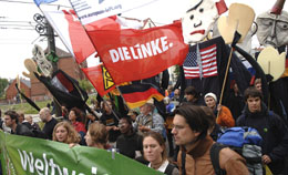2日,抗議者參加在德國東北部城市羅斯托克舉行的反對八國集團(簡稱G8)首腦會議的游行集會。當(dāng)日,共有來自世界各地的10萬多人參加了在羅斯托克舉行的反對八國集團首腦會議的游行集會。