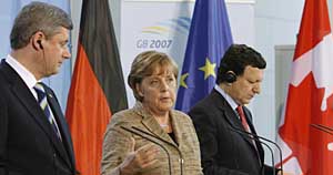 | 4日,德國總理默克爾(中)、加拿大總理哈珀(左)與歐盟委員會主席巴羅佐在德國柏林出席聯(lián)合記者招待會。新華社/法新 | 八國集團(tuán)首腦會議于6日在德國北部海濱小城海利根達(dá)姆召開。與會領(lǐng)導(dǎo)人將討論氣候變化、能源安全、投資自由化、知識產(chǎn)權(quán)保護(hù)及非洲發(fā)展等一系列全球問題,并將與包括中國在內(nèi)的發(fā)展中大國領(lǐng)導(dǎo)人舉行對話。 會議東道主、八國集團(tuán)今年的主席國德國希望本屆峰會在環(huán)保和社會責(zé)任等方面能夠制定出新的“游戲規(guī)則”,搭建未來全球化發(fā)展的框架。然而,在當(dāng)今各國利益相互融合又激烈競爭的背景下,制定兼顧各方利益的新規(guī)則談何容易。本屆八國峰會在這方面到底能取得多大成果,格外引人關(guān)注。