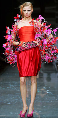 名設(shè)計師之所以有名,必有其不敗之處。例如,他們源源不竭、千奇百怪的創(chuàng)意與構(gòu)思有時令人目瞪口呆,有時令人贊不絕口。 7月2日時裝周第一天,世界頂級時裝品牌迪奧為慶祝品牌誕生60周年,在巴黎近郊的昔日皇宮——凡爾賽宮內(nèi)舉行了一場時尚派對,場面盛大,極盡奢華之能事。一批世界超模穿著令人眼花繚亂的華麗晚裝和上世紀(jì)40年代風(fēng)格的西裝亮相,仿佛一個個美人兒從畫中走出。也難怪,這些服裝的創(chuàng)意本就來自達(dá)·芬奇、畢加索、米開朗基羅、莫奈、雷諾阿等大師的畫作,更何況它們出自迪奧的御用設(shè)計師——加利亞諾之手。舞臺背景音樂選擇了西班牙弗拉門戈舞曲,讓人憶起加利亞諾一半的西班牙血統(tǒng)。當(dāng)加利亞諾身著華麗的傳統(tǒng)斗牛裝束現(xiàn)身,時裝秀現(xiàn)場氣氛達(dá)到高潮——這是他的風(fēng)格,親自扮演最后一位讓人“驚艷”的模特。