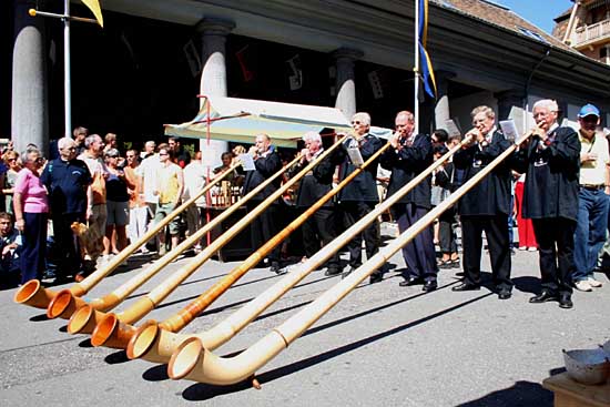 25日,幾位藝人在瑞士沃韋街頭吹響阿爾卑斯號角。當日,沃韋舉辦第15屆街頭藝人節(jié),藝人們在沃韋老城街頭設立的7個演出點表演雜技、魔術等節(jié)目。