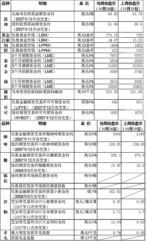 當(dāng)周芝加哥小麥期貨價(jià)格連續(xù)幾個(gè)交易日深度下跌,盤中一度跌破每蒲式耳8美元大關(guān)。分析師稱,這一方面是因?yàn)槿蛑饕男←溸M(jìn)口國(guó)可能在前一階段已購(gòu)進(jìn)大量小麥,導(dǎo)致美國(guó)小麥的出口速度短期內(nèi)下滑;另一方面,有關(guān)澳大利亞小麥減產(chǎn)的消息已被市場(chǎng)吸收,同時(shí)小麥種植面積預(yù)計(jì)在明年又將大幅度增加,市場(chǎng)對(duì)未來(lái)供給的擔(dān)心因而得到緩解。 受中東局勢(shì)趨緊、美國(guó)原油庫(kù)存減少、美元走軟以及投機(jī)炒作等因素影響,當(dāng)周紐約市場(chǎng)原油期貨價(jià)格兩次創(chuàng)下收盤價(jià)新高。美國(guó)能源部24日公布報(bào)告稱,在截至19日的一周里,美國(guó)原油商業(yè)庫(kù)存猛降530萬(wàn)桶,至3.166億桶,大大超出市場(chǎng)的預(yù)期。受上述因素影響,繼25日每桶大漲3.36美元并收于90.46美元之后,26日紐約市場(chǎng)原油期貨價(jià)格每桶又比前一個(gè)交易日上漲1.40美元,收于91.86美元,再創(chuàng)歷史新高。 油價(jià)上漲和美元走軟引發(fā)了市場(chǎng)對(duì)通脹加劇的擔(dān)憂,投資者因此積極買入黃金等貴金屬實(shí)現(xiàn)投資保值,這是當(dāng)周貴金屬價(jià)格上漲的主要原因。26日,倫敦市場(chǎng)黃金價(jià)格一度攀升至每盎司782美元,創(chuàng)下自1980年1月來(lái)的最高紀(jì)錄。 與貴金屬價(jià)格走勢(shì)相反,銅、鋁、鎳、鉛等基本金屬期價(jià)出現(xiàn)小幅下滑現(xiàn)象。分析人士稱,存貨的增加和基本金屬消費(fèi)大國(guó)——美國(guó)經(jīng)濟(jì)數(shù)據(jù)的疲軟是其價(jià)格回落的主要原因。不過(guò),也有業(yè)內(nèi)人士指出,美聯(lián)儲(chǔ)有望在10月31日召開(kāi)的貨幣政策會(huì)議上做出再次降息的決定,此舉將推動(dòng)美國(guó)對(duì)大宗商品需求量的增加,因此基本金屬價(jià)格仍有反彈的希望。 國(guó)際油價(jià)的攀升也推高了橡膠、玉米和糖的價(jià)格。在橡膠合成的生產(chǎn)過(guò)程中原油起著不可或缺的作用;玉米和用來(lái)榨糖的甘蔗均是制造乙醇這種廉價(jià)生物燃料的重要原料,原油價(jià)格持續(xù)上漲對(duì)玉米和糖的價(jià)格上漲起到了推波助瀾的作用。